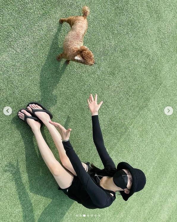 공개된 사진 속에는 강지영이 반려견과 잔디밭에서 행복한 시간을 보내고 있다.