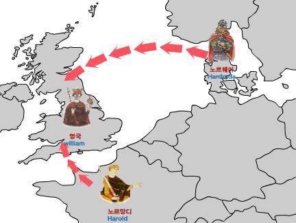 한편 가장 중요한 침략은 1066년 일어났다. 그 해 프랑스 지역의 한 공국(그땐 프랑스라는 단일국가의 개념도 모호했고, 프랑스 왕이라는 지위보다 각 공국의 왕이나 지방 영주들의 힘이 더 강했다)이었던 노르망디 공국이 잉글랜드 영토를 점령한 것이다. 이것을 ‘노르만 정복’(Norman Conquest)이라고 부른다. 이후 노르만 공국의 ‘정복자 윌리엄’(William the Conqueror)는 잉글랜드 영토와 노르망디 영토를 동시에 지배했다.