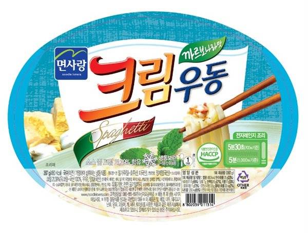 부드러운 까르보나라 소스를 좋아하는 사람이라면 푹 빠진다는 면사랑 크림우동은 한 개에 3,500원으로, 전자레인지에 5분 30초동안 데워서 젓가락으로 잘 비벼먹기만 하면 된다. 까르보나라 소스에 우동 면을 넣은 누구나 예상할 수 있는 맛을 갖고 있는 면사랑 크림우동은 아주 느끼하지 않아 부담없는 야식으로 먹기에 좋다.
