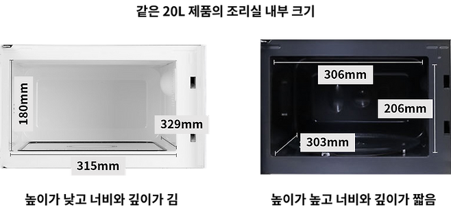 간혹 큰 용량을 광고하는 제품 중 깊이는 그대로이고 너비만 길어진 제품이 있는데, 이런 경우 더 큰 접시가 들어갈 수는 있어도 회전하지 못하기 때문에 의미가 없습니다.