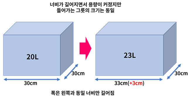 같은 용량이라도 형태에 따라 높이가 높고 너비가 짧은 제품도 있고, 높이가 낮고 너비가 긴 제품이 있습니다. 같은 제품도 3cm가량 차이가 나기도 합니다.