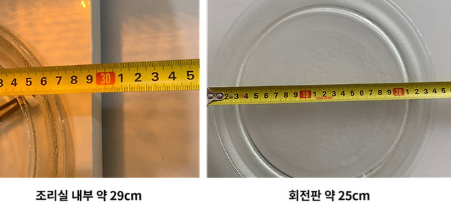 실제로 최대로 사용할 수 있는 접시나 그릇의 크기는 조리실 크기가 아닌 회전판 크기로, 조리실 내부 대비 3~5cm 정도 작습니다.