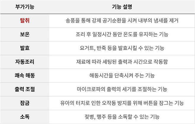 - 탈취 기능 : 전자레인지 사용 시 내부의 음식 냄새가 나는 경우가 많은데, 탈취 기능이 있으면 마이크로파 방출 없이 송풍으로 강제 공기 순환을 하기 때문에 비교적 빠른 냄새 제거가 가능합니다. 실제 사용자들의 후기도 냄새가 빨리 빠져서 편리하다고 느끼는 기능입니다.