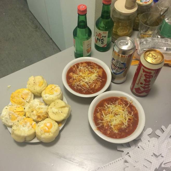 기숙사 파티는 서로 음식을 해오다보니 자기 나라 음식을 해오는 경우가 많았어요. 이탈리아 친구의 초코 파스타부터 프랑스 친구의 마카롱, 당근 케이크 그리고 우리의 계란빵과 떡볶이 까지 ㅋㅋㅋㅋㅋ 계란빵은 저의 작품입니다. 맛은 별...로였지만 해본 거에 의의를 두며... 떡볶이도 해갔지만 우리가 다먹음ㅎㅎ