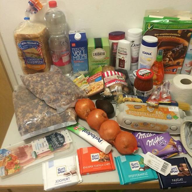 마트 가는 길은 항상 설레자나요... 급할 때는 기숙사 바로 앞에 있는 홈플러스 같은 마트에서 장을 봅니다.그리고 지역은 오스트리아지만 독일까지 걸어서 갈 수 있기 때문에 가끔 큰 맘먹고 1시간 걸어서 독일 가서 장도 보고 와요 ㅎㅎ 산책도 할 겸 물가가 훨씬 더 저렴하기 때문! 이렇게 쟁여두고 겨울을 납니다. ㅎㅎ