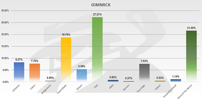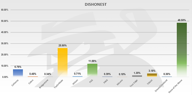 이 단어와 관련된 좋은 소식은 20% 이상의 응답자가 설문 조사에 포함 된 브랜드와 상술이라는 단어를 연관시키지 않았다는 것입니다. 이는 제조사가 주장하는 제품과 기능에 대해 어느 정도 믿음을 나타내는 것이라고 볼 수 있습니다. “상술”과 가장 연관된 브랜드는 27.21%로 PXG가 가장 높았으며, TaylorMade(18.76%)와 Callaway(8.27%)가 그 뒤를 이었습니다. Titleist, PING, Mizuno는 모두 1% 이하로 가장 낮았으며, Tour Edge, Wilson 및 Cobra에 대한 응답 비율은 이례적인 것으로 나타났습니다.