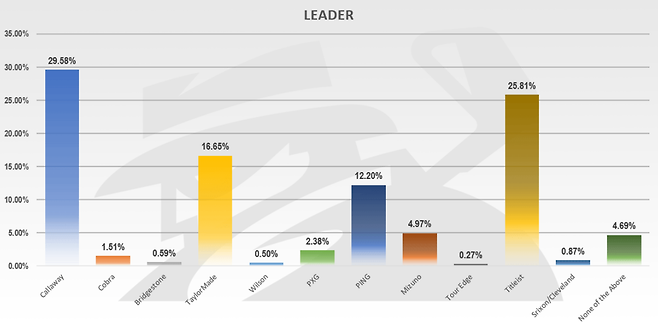 높은 가격구조와 대담한 마케팅 슬로건(“단언컨대, 그 누구도 우리처럼 클럽을 만들지 못합니다"), 그리고 설립자 Bob Parson의 독특한 경영스타일을 고려한다면 PXG(42.54%)가 1위인 것은 당연한 결과입니다. 2위Titleist(21.53%)와 3위 TaylorMade(17.89%)를 더한다면 총 82%가 넘으며, Callaway까지 포함하면 90%가 넘습니다.