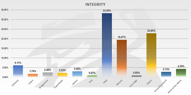 진실성은 정직함과 도덕성이 결합된 것으로 생각할 수 있습니다. 우리는 당신의 응답에 PING이 자주 나올것을 예상했습니다. 또한, Titleist 역시 상위에 가까웠으며 Mizuno도 독자들로부터 높은 평가를 받았습니다. 그러나 시장의 리더인 Callaway와 TaylorMade는 다른 긍정적인 단어들의 결과와 달리 “진실성”에 저조한 응답률을 보였습니다.