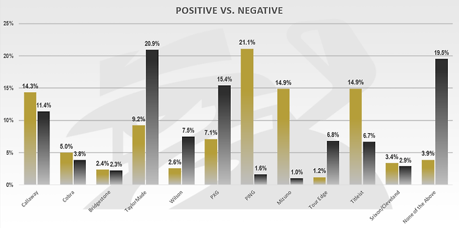 반면, 새로운 브랜드 PXG와 대형 브랜드 TaylorMade는 부정적인 반응이 긍정적인 비율에 비해 가장 높게 조사됬습니다. 그러나 긍정적인 단어에서도 높은 응답을 보였다는 점을 감안하면, 두 브랜드는 시장에서 양극화 성향이 있다고 할 수 있습니다. 응답의 전반적인 비율은 그다지 높지 않았지만 Wilson과 Tour Edge의 결과는 전반적으로 부정적인 시선을 제시합니다. 긍정과 부정적인 비율이 비슷한 Callaway는 전체 설문 조사에서 가장 많은 선택을 받았습니다. 업계 리더로서 더 긍정적인 반응을 얻으리라 기대할 수 있겠지만, 오히려 리더이기 때문에 적대감을 가진 분들도 있습니다.