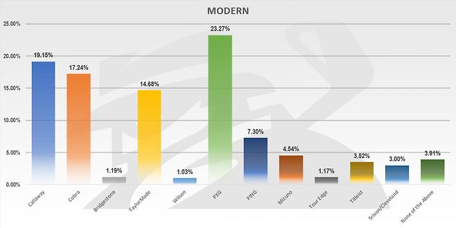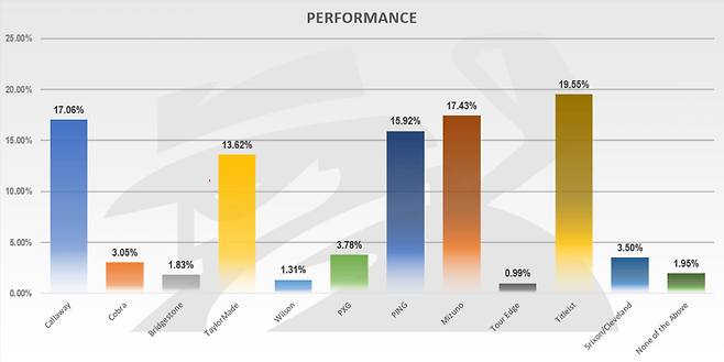 PING은 엔지니어링 회사로서 확고하게 자리 매김했기 때문에 가장 높은 응답률(29.52%)을 받을것으로 예측했습니다. Callaway는 거의 16%의 선택을 받았으며, 많은 사람들로부터 마케팅을 뒷받침하는 진정한 R&D가 있다고 인정받은 듯 합니다. 놀라운 점은 13% 이상의 응답을 얻은 PXG 입니다. 그것은 TaylorMade와 Mizuno보다 더 많은 응답율이며, Titleist를 선택한 것보다 거의 2배입니다.
