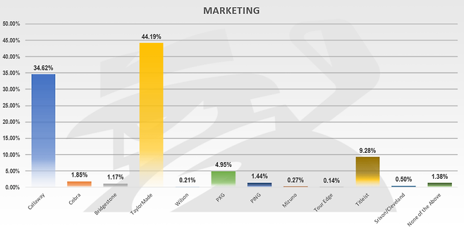 “마케팅” 단어는 본질적으로 부정적이지 않습니다. 그러나 골프 장비 업계에서는 R&D의 반대로 비춰지는 경우가 종종 있습니다. 광고 예산이 큰 회사일수록 마케팅 활동 또한 많기 때문에 Callaway 및 TaylorMade가 가장 높은 비율을 차지할 것으로 예상됩니다. 반면, Titleist의 활발한 골프공 마케팅 노력에도 불구하고 이 단어와 관련을 지은 응답자는 10% 미만으로 나타났습니다.