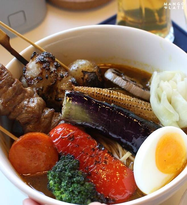히비는 스프 카레에 무려 면을 넣고 다양한 구이류 토핑까지 추가해 든든한 한 그릇 식사로 즐길 수 있어요.