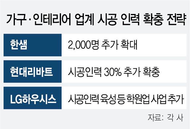 하지만 단기간 우수한 시공 인력을 육성하기가 쉽지 않기 때문에 시장에서는 시공 인력 빼가기 경쟁도 벌어지고 있다는 지적이다. 가구 업계 한 관계자는 “한샘 등 주요 회사들의 시공인력들의 이직하는 사례가 늘어나고 있다”며 “귀한 몸이 된 시공 기사들이 프로 운동선수들이 팀을 옮겨 가며 연봉을 높이는 것처럼 시장이 달아오르고 있다”고 설명했다.