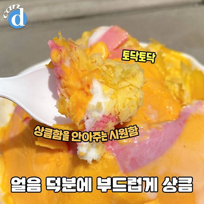 망고 패션 샤베트 얼음을 그릇에 한가득 얹은 후