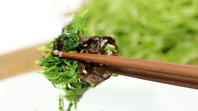 세발나물과 목이버섯을 먹기 좋은 크기로 썬 뒤 양념을 모두 넣고 버무립니다.