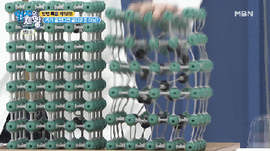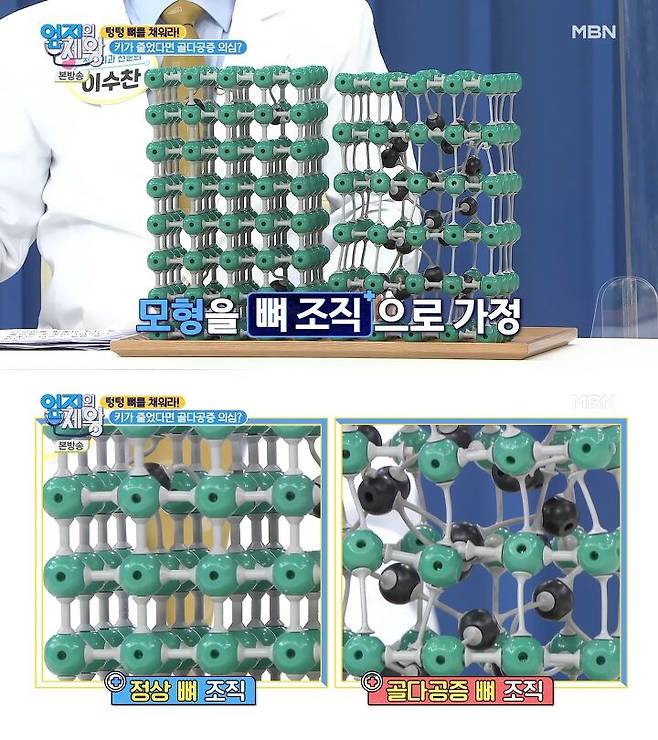 이 모형을 뼈조직으로 가정해보면, 왼쪽이 정상 뼈조직이고 오른쪽이 골다공증 뼈조직입니다.
