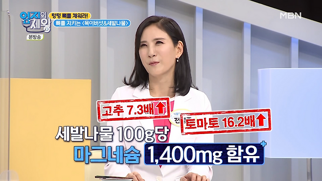 세발나물에는 100g당 마그네슘이 1,400mg 함유되어 있어 고추의 7배, 토마토의 16배에 달하는 수치를 보입니다.