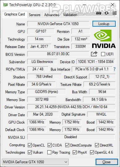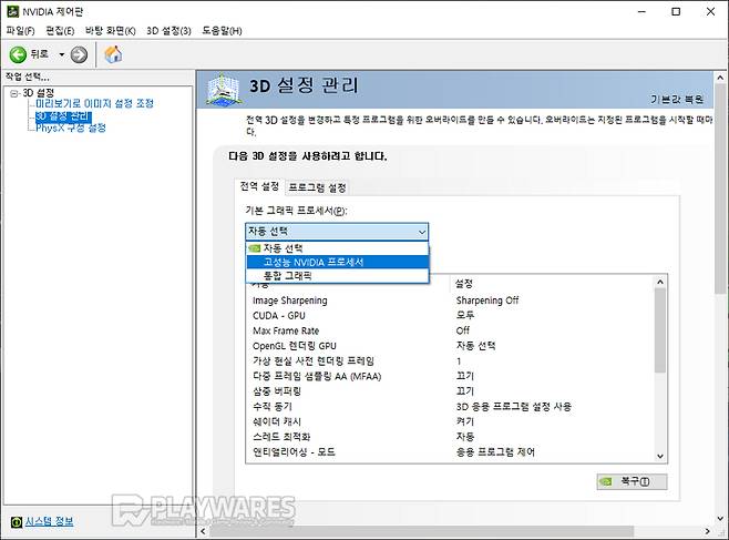 벤치마크 진행시 NVIDIA 제어판에서 "고성능 NVIDIA 프로세서"로 고정하여 내장 그래픽이 활성화되는 것을 방지하였으며, 테스트에 사용된 그래픽 드라이버 버전은 442.59입니다.
