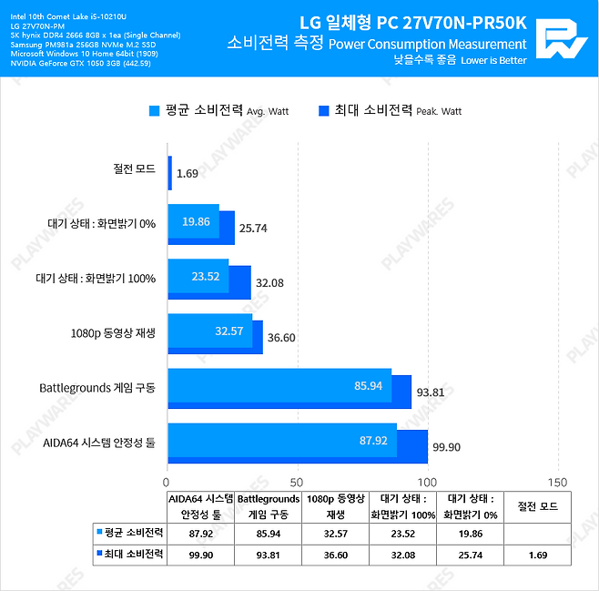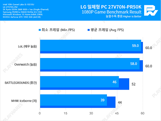 대개 인텔 UHD Graphics 내장 그래픽을 사용하던 기존의 일체형 PC들과는 달리, NVIDIA GeForce GTX 1050 3GB 외장 그래픽을 탑재하여 LOL, 오버워치와 같은 게임은 무난하게 60fps 플레이가 가능하고 배틀그라운드의 경우에도 낮음 프리셋으로 원활한 플레이가 가능하겠습니다. 물론 일체형 PC의 주 용도가 게임은 아니겠으나, 기존 일체형 PC보다 좀 더 넓은 활용도를 갖추었다는 것은 장점으로 볼 수 있겠습니다.