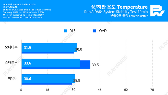 모니터 스탠드라는 좁은 공간 내에 PC 본체와 관련된 모든 부품들이 장착되는 만큼 소음치나 발열량, 더 나아가서는 발열로 인한 부품 수명 등이 걱정되기 마련인데... LG 일체형 PC 27V70N-PR50K는 기본적으로 주 발열원에 사용자의 손이 닿을 일도 없겠지만, 풀로드 시 40℃를 넘지 않는 준수한 발열량을 보여 부품 수명이나 잔고장에 대한 걱정은 적을 것으로 여겨집니다.