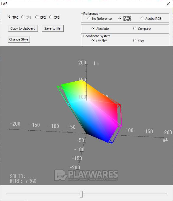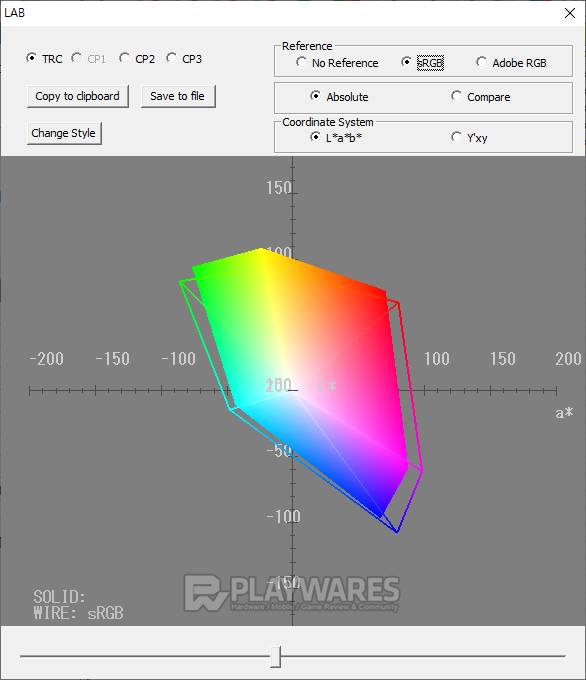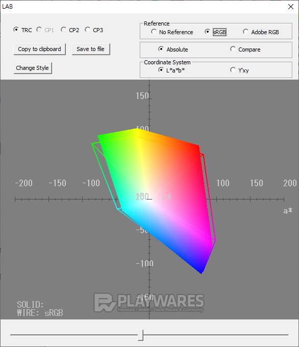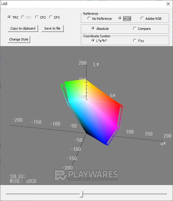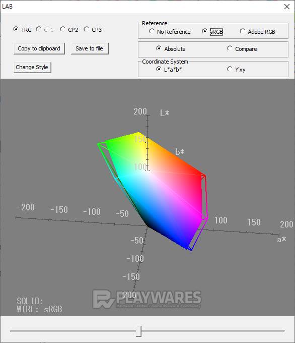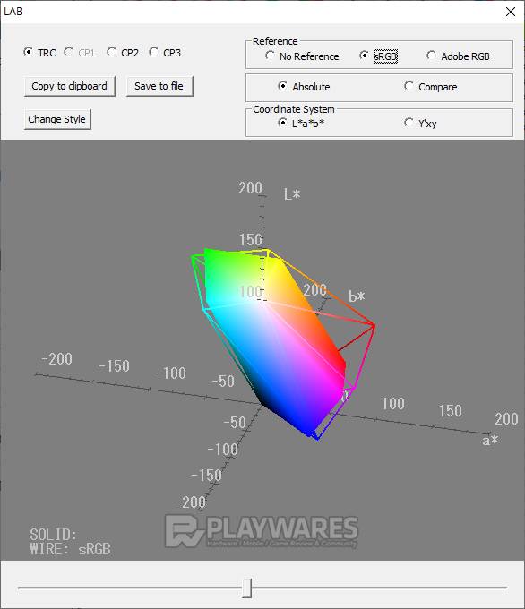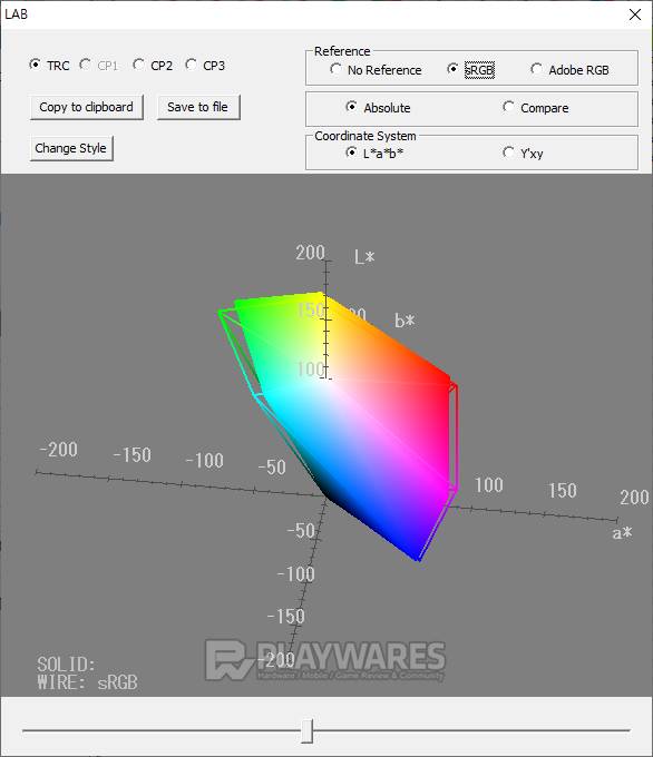 색재현(Color Reproduction Range) 결과를 통해 제품 고유의 표현 방식을 알 수 있습니다. 제품 각각의 스펙을 참고하여 sRGB 또는 Adobe RGB 기준에 색공간(색역)이 얼마만큼 근접해 있는지 확인합니다. 기준을 모두 만족하지 않더라도 사용에 무리는 없으나 기준에 가깝고 넓은 색 표현 범위를 가질수록 작업, 감상 등으로 두루 사용하기 효과적입니다.