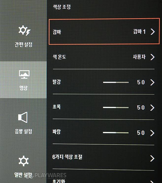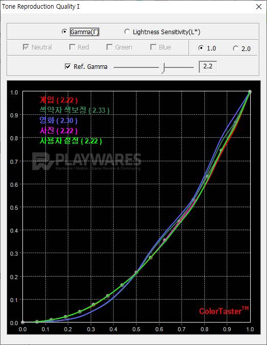 감마(Gamma)는 곡선 형태에 따라 색의 진함/연함이 다르게 표현되는 특징이 있습니다. 같은 색이라도 감마에 따라 전혀 다른 느낌으로 보여질 수 있기 때문에 별도의 디스플레이 옵션(게임, 영화, 사진 등...)이 아닌 경우 표준 감마(2.2)에 가까운 상태를 유지하는 것이 작업, 컨텐츠 감상 등의 활용에 두루 효과적입니다.