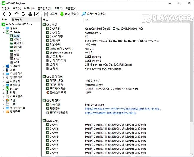 LG 일체형 PC 27V70N-PR50K에 탑재된 Intel 10세대 Core i5-10210U Comet Lake 프로세서(Intel ARK 페이지 링크)는 6MB의 스마트 캐시와 기본 1.60GHz / 터보 4.20GHz의 클럭을 보유하고 있으며, 4개의 코어 및 8개의 스레드를 제공합니다.