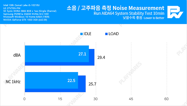 가장 높은 소음치를 보이는 풀로드 상태에서도 30dBA를 넘지 않는 정숙한 모습을 보이기 때문에, 대부분의 가정/업무 환경에서 불편함없이 사용할 수 있을 것으로 판단됩니다.