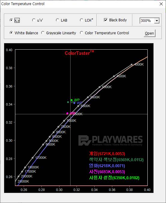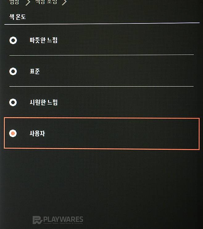 색 온도(Color Temperature)는 따뜻한(Warm), 차가운(Cool) 또는 붉은(Reddish), 푸른(Bluish) 화면으로 특징을 구분합니다. 색온도 표준 6500K를 기준으로 값이 낮을수록 화면이 붉게 느껴지며 반대로 높은 경우엔 화면이 푸르게 느껴지며 작업을 고려할 경우 색 온도 표준을 권유하지만, 일반 사용에서는 취향에 따라 선택해도 무방한 항목입니다.