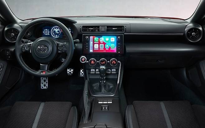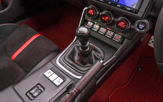 실내 디자인은 여전히 투박하다. 마치 무게를 줄이기 위해 불필요한 장비를 모두 덜어낸 경주차를 보는 듯하다. 스티어링 휠 가운데 자리했던 ‘86’ 마크를 떼고, 6시 방향에 ‘GR’ 엠블럼을 달았다. 계기판은 아날로그 방식에서 7인치 TFT 스크린으로 진화했다. 뭉툭한 기어 레버와 수동식 사이드브레이크는 그대로다.