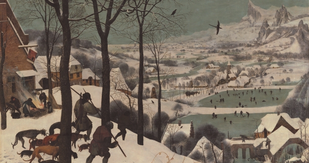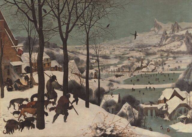 ‘눈 속의 사냥꾼’은 브뤼헐이 사계절을 주제로 제작한 6개의 연작 중 가장 유명한 작품입니다. 폭설이 내린 뒤의 마을 풍경을 배경으로 사냥을 끝내고 귀가하는 사냥꾼들과 노동하는 장면, 한겨울 놀이 문화를 담은 그림이에요. 브뤼헐이 마흔이던 1565년에 제작한 이 그림에는 다양한 군상의 인물들과 함께 눈으로 뒤덮인 겨울 풍경 속의 마을이 등장해요. 그림 전면(前面)에 사냥에서 돌아오는 세 명의 사냥꾼과 사냥개들, 그 왼쪽 사선을 따라 아이를 포함해 다섯 명의 사람이 보입니다. 그들은 지금 모닥불로 돼지털을 그을리고 있죠. 돼지 도살이 주로 1월에 벌어지는 연중행사였던 당시 풍습을 감안하면 1월의 풍경을 그린 것임을 알 수 있어요.