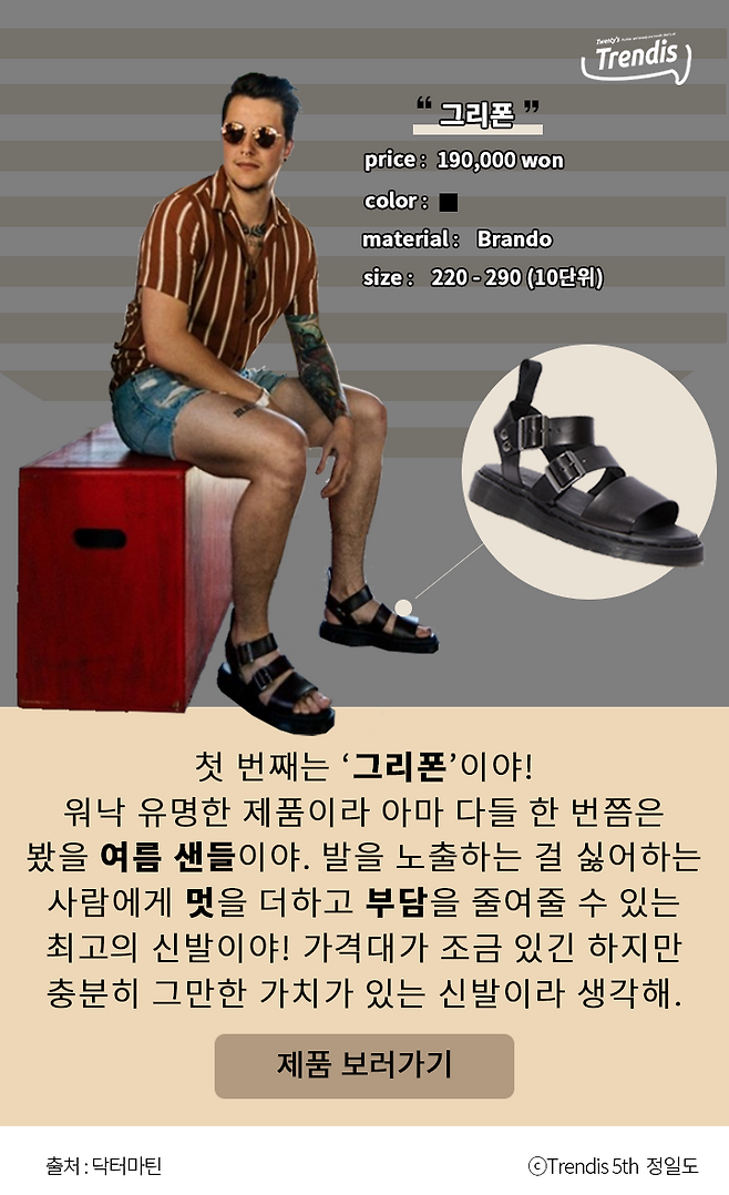 첫 번째는 ‘그리폰’이야! 워낙 유명한 제품이라 아마 다들 한 번쯤은 봤을 여름 샌들이야. 발을 노출하는 걸 싫어하는 사람에게 멋을 더하고 부담을 줄여줄 수 있는 최고의 신발이야! 가격대가 조금 있긴 하지만 충분히 그만한 가치가 있는 신발이라 생각해.