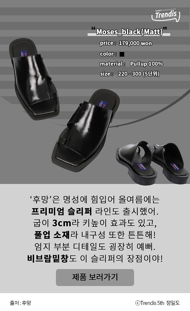 ‘후망’은 명성에 힘입어 올여름에는 프리미엄 슬리퍼 라인도 출시했어. 굽이 3cm라 키높이 효과도 있고, 풀업 소재라 내구성 또한 튼튼해! 엄지 부분 디테일도 굉장히 예뻐. 비브람밑창도 이 슬리퍼의 장점이야!
