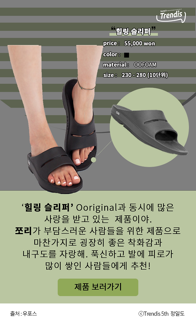 ‘힐링 슬리퍼’ Ooriginal과 동시에 많은 사랑을 받고 있는 제품이야. 쪼리가 부담스러운 사람들을 위한 제품으로 마찬가지로 굉장히 좋은 착화감과 내구도를 자랑해. 푹신하고 발에 피로가 많이 쌓인 사람들에게 추천!