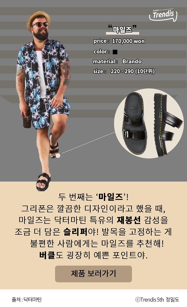 두 번째는 ‘마일즈’! 그리폰은 깔끔한 디자인이라고 했을 때, 마일즈는 닥터마틴 특유의 재봉선 감성을 조금 더 담은 슬리퍼야! 발목을 고정하는 게 불편한 사람에게는 마일즈를 추천해! 버클도 굉장히 예쁜 포인트야.