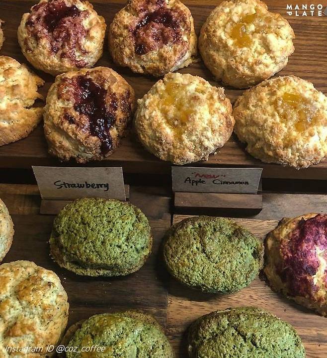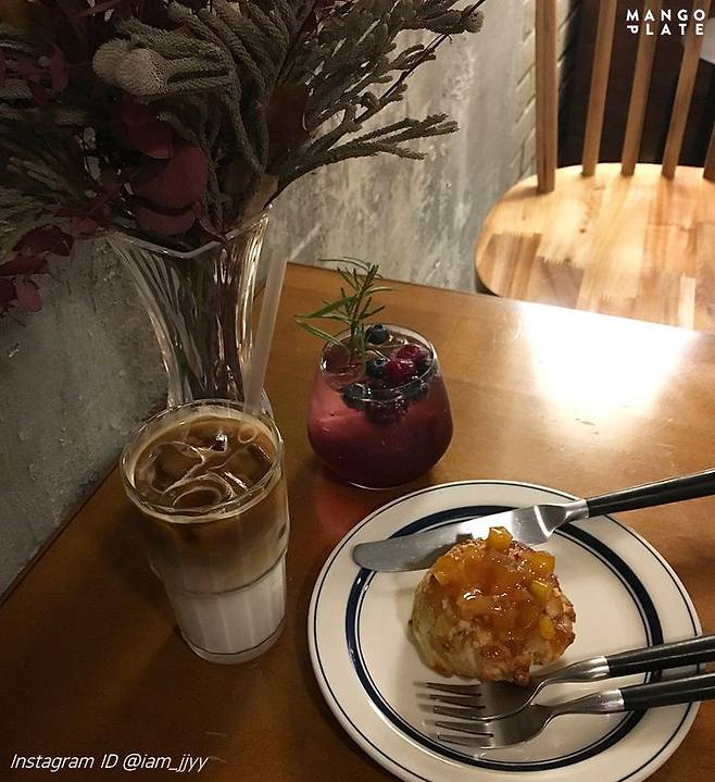 드라이플라워와 원목이 아늑한 분위기를 더해주는 반월당 카페. 특히 다양한 종류의 스콘이 반겨주는데요! 바질 토마토, 자색고구마, 말차 앙버터 등의 이곳에서 맛볼 수 있는 특별한 맛들도 가득! 그중 애플 시나몬 잼이 올라간 시나몬 애플 스콘은 에디터의 추천픽!