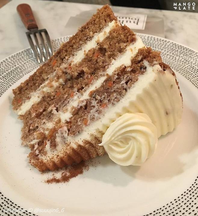 시나몬 향 가득한 케이크를 꼽으라면 당근케이크가 가장 먼저 생각나죠? 호두, 코코넛, 시나몬, 당근이 듬뿍 들어가 씹는 식감까지! 중간에 샌드 된 크림치즈 버터 프로스팅이 부드러운 맛을 한층 업 시켜줘요. 따뜻한 아메리카노와 찰떡궁합!