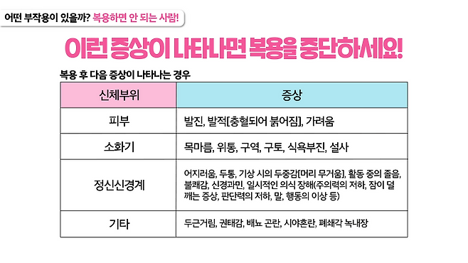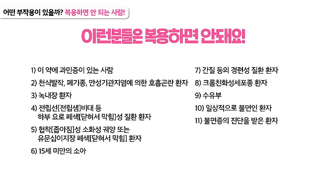 고령의 환자나 부작용과 관련된 질환을 앓고 있는 사람, 여러 가지 약물을 복용하는 사람이라면 부작용에 특히 민감하기 때문에 복용시 주의를 해야해요.