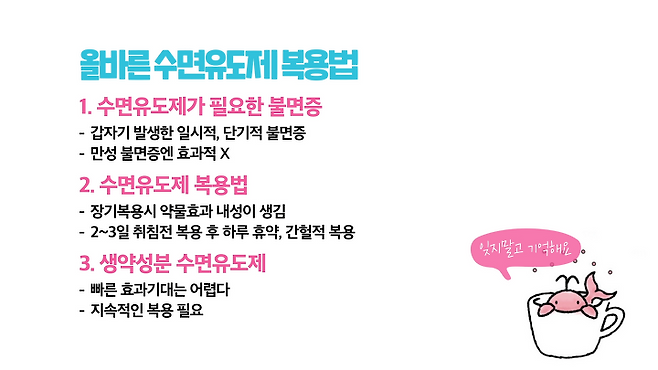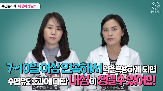 그래서 앞서 설명드린대로 중간에 휴약일을 두면서 한 번에 3일정도씩 간헐적으로 복용하셔야 합니다. 그렇게 복용하면 수면유도 효과에 대한 내성을 줄일 수 있어요.