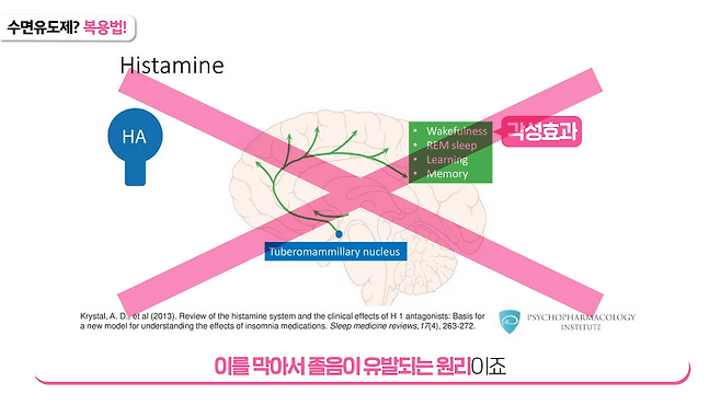 히스타민이 분비되면 뇌에서는 각성효과가 나타나는데 이를 막아서 졸음이 유발되는 원리입니다.