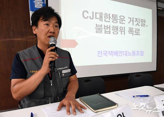 택배연대노동조합원들이 CJ대한통운이 노조 소속 택배기사에게 일감을 주지 않고 직영기사에게 물량을 주고 있다고 주장하며 배달업무보다 더 많은 시간이 들어가는 배송물량 분류작업 개선 등을 촉구했다. 이한형 기자