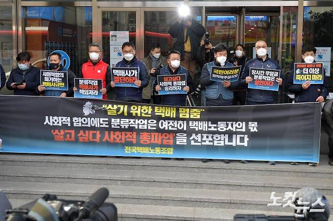 전국택배연대노동조합은 잇따른 택배노동자 사망사건 대책을 촉구하며 이날 총파업에 나섰다. 노조 측은 "'공짜노동 분류작업'으로 하루 13시간에 달하는 장시간 노동에 시달리고 있다"며 열악한 노동환경을 지적했다. 연합뉴스