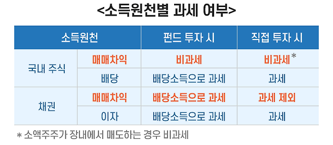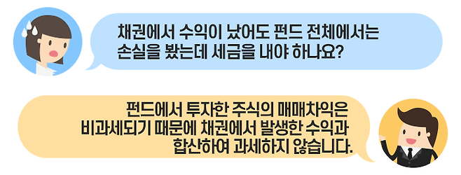 반면 채권의 경우 직접 투자할 때는 보유기간 동안 발생한 이자에 대해서만 과세하고 매매차익은 세금을 과세하지 않지만, 채권을 펀드에 담아 투자하는 경우 이자뿐만 아니라 채권의 매매차익도 배당소득으로 과세합니다.