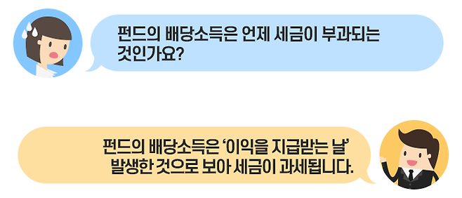 1년 동안 발생한 이자소득 및 배당소득이 2천만 원을 초과하는 경우 금융소득종합과세 대상자가 되기 때문에 펀드의 배당소득이 언제 발생하는지 아는 것은 절세에서 중요한 포인트입니다.