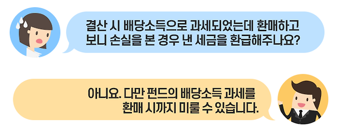 결산 시 배당소득으로 과세되었는데 환매하고 보니 최종적으로 펀드투자로 손실을 본 경우 결산 시 낸 세금이 환급되지 않습니다.