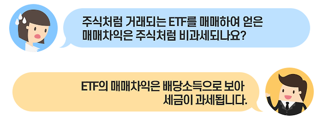 ETF(상장지수펀드)는 주식처럼 거래소에 상장되어 일반주식처럼 자유롭게 사고팔 수 있지만 주식이 아닌 펀드입니다. 따라서 ETF에서 발생한 소득은 배당소득으로 구분되어 과세됩니다.