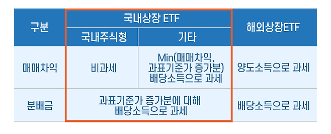 국내상장ETF 중 국내 주식형ETF의 매매차익에 대해서는 과세되지 않으며, 해외상장ETF의 매매차익은 해외주식과 동일하게 양도소득세(22%, 지방소득세 포함)가 과세됩니다.