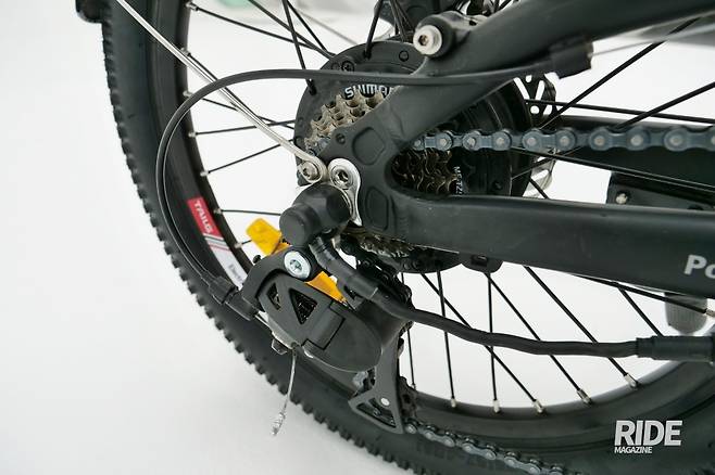 구동계는 시마노의 7단 변속기가 장착 되어있고 52t 크랭크 구성이다. 전원을 끄고서도 평지에서는 답답하지 않은 주행을 할 수가 있어 배터리의 잔량이 적어 아껴야 하는 상황이거나 운동을 목적으로 타더라도 이 정도라면 큰 무리가 없다. 라이딩을 하면서 쉬프트레버로 변속을 해보면 부드럽게 변속되는데 PAS 단계와 알맞은 기어 변속을 조합하며 달리면 나름달리는 재미를 느낄 수 있다. 이 모델의 특징 중 하나는 듀얼 구동방식 모델의 경우 PAS 방식과 스로틀 방식이 동시에 구현할 수 있다는 것인데 스로틀 레버를 당겨 간단하게 스로틀모드로 전기스쿠터와 같은 편리한 주행이 가능하다. 아쉽게도 시승모델은 듀얼 구동방식 모델이 아니라 스로틀레버는 장착되어 있지 않아 스로틀 모드를 경험해 볼 수는 없었고 PAS 방식으로만 시승을 진행했다.