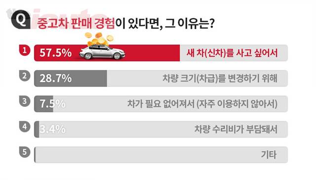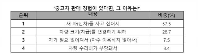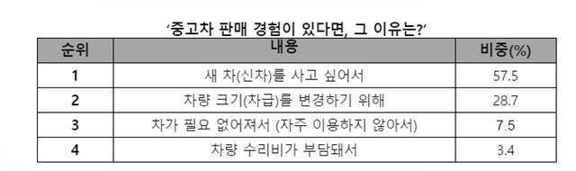 한편, 내 차를 팔아본 경험이 있는 사람 중 응답자의 절반 이상은 신차 구입을 위한 것으로 나타났다. 응답자의 57.5%가 판매 이유로 ‘신차를 사고 싶어서’를 선택했으며, 차량의 크기(차급)를 변경하고 싶었다는 응답은 28.7%였다.