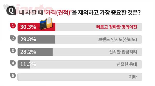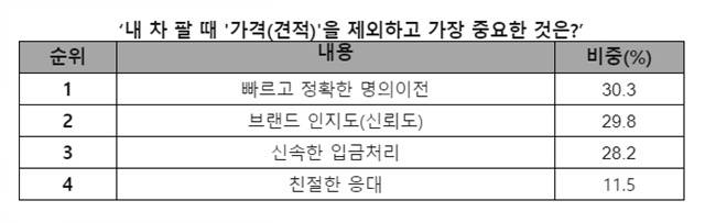 또한 ‘내 차를 팔 때 가격(견적)을 제외하고 가장 중요하게 생각하는 것’을 묻는 질문에는 ‘빠르고 정확한 명의 이전(30.3%)’, ‘브랜드 인지도(29.8%)’, ‘신속한 입금처리(28.2%)’를 비등하게 선택해 믿고 맡길 수 있는 업체의 역량을 중요하게 생각하는 것으로 분석된다.